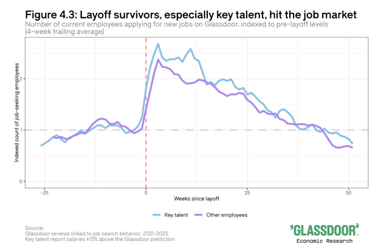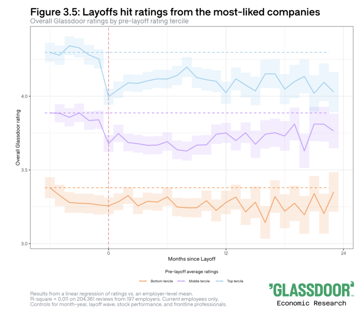 Glassdoor har möjlighet att spåra jobbsökandet och ser en kraftig ökning bland "överlevarna". Inte för att större andel av dem söker nya jobb men för att nedskärningarna får så många fler av dem att lämna omdömen och därmed exponeras för nya möjligheter. Detta gäller särskilt nyckelmedarbetare. Givetvis kommer deras nyfikenhet på nya jobb att leda till att fler än annars av de medarbetare man tänkt sig behålla kommer att försvinna. Hur påverkar det verksamheten, tror du? Rekryteringskostnader? Erfarenhetsförlust? Kundrelationer? Produktivitet?